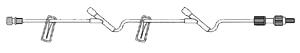 32" Standard bore I.V. Extension Set, Two Injection Sites, DEHP-Free, Latex-Free Female Luer Lock Adapter, Rotating Male Luer Lock, Two Latex-Free Injection Sites, Two Slide Clamps, Poly Pouch FDA registered, CE Mark, ISO 9001 certified.